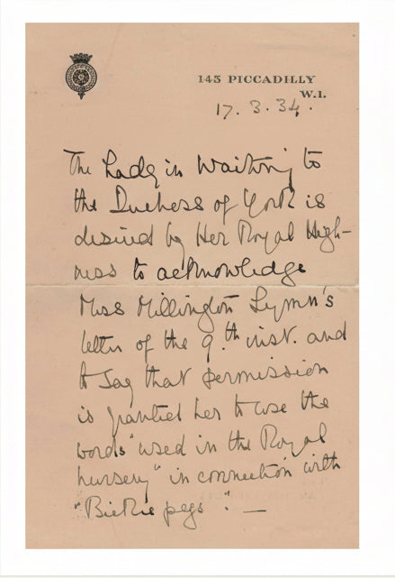 Bickiepegs gained recognition from members of the British Royal Family, including Queen Elizabeth the Queen Mother, and were used in the Royal Nurseries during this period.
